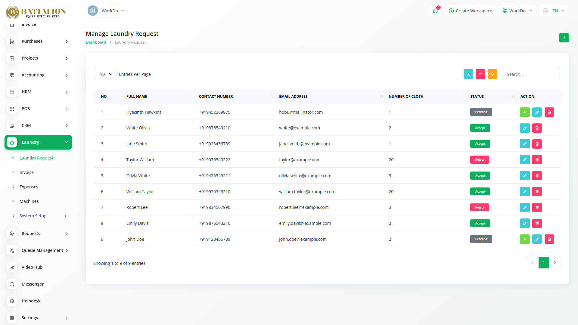Tailored to your unique needs, this module centralizes all laundry-related activities-from seamless request submissions and administrative approvals to real-time tracking via an intuitive dashboard.