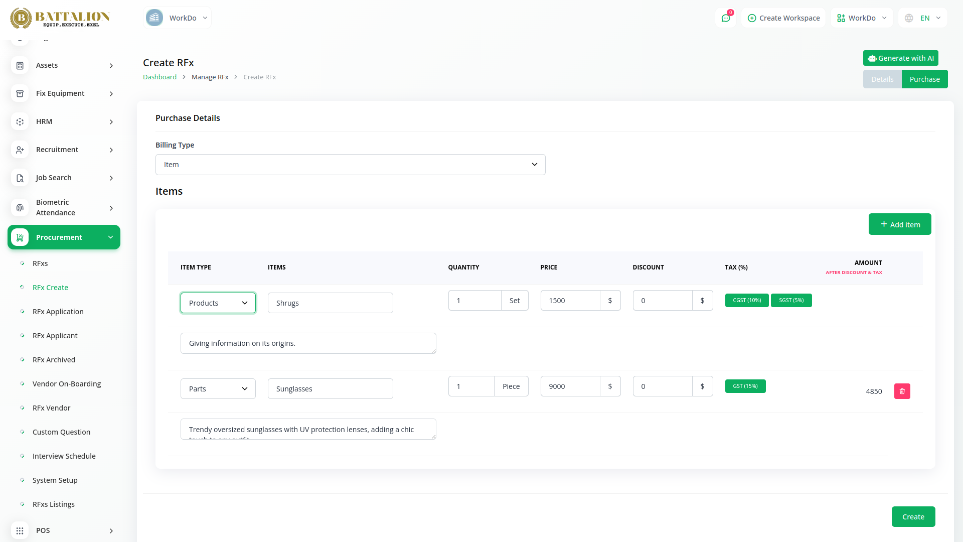 Managing procurement can be time-consuming and complex. Battalion streamlines the entire process by offering a centralized hub for all your purchasing needs. Easily create purchase orders, manage vendor details, track expenses, and access real-time insights - all through an intuitive, user-friendly interface.