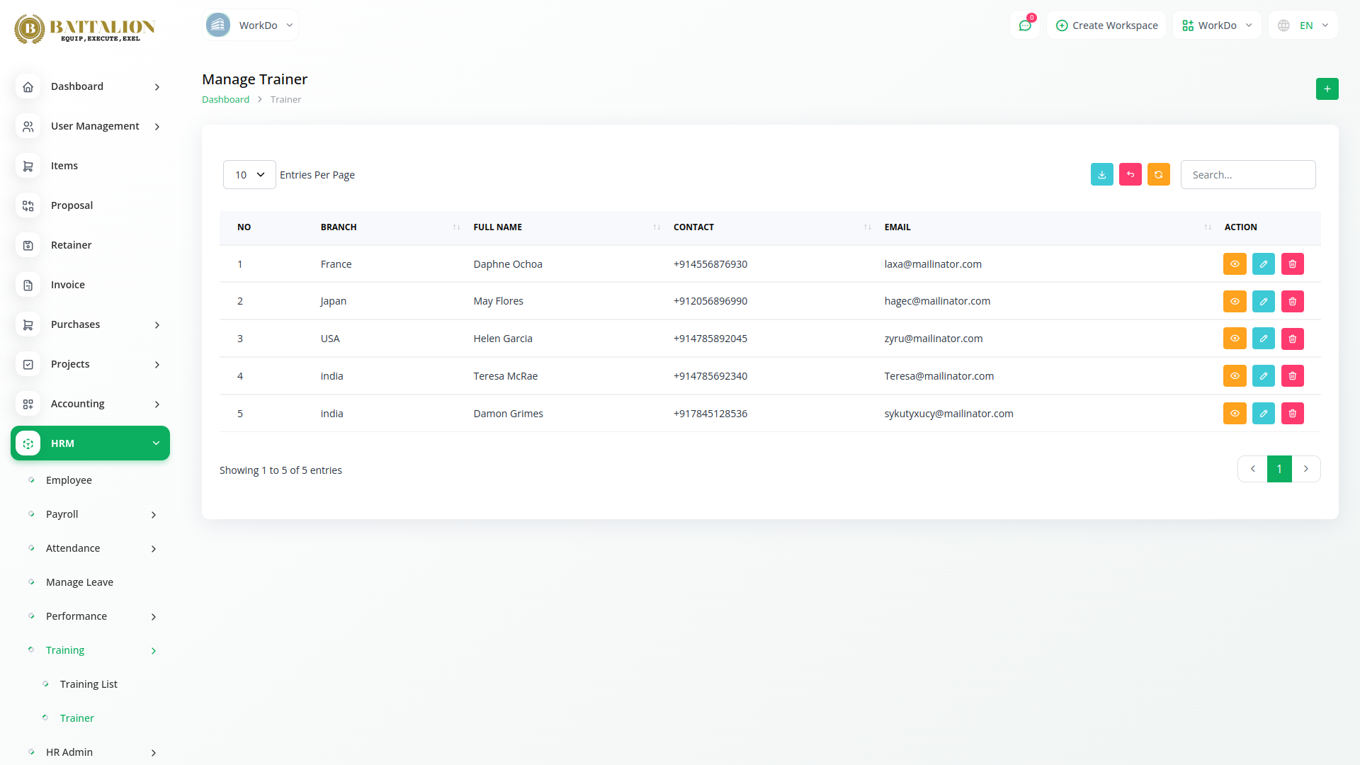 Employee training is essential in today’s dynamic work environment. With Battalion’s HRM Module, you can efficiently manage and monitor all training activities by assigning specific details such as cost, duration, training type, and mode for each employee. Maintain a streamlined overview of your training programs, and keep an organized list of trainers with the module’s easy-to-use trainer listing feature-ensuring every learning initiative is well-tracked and effective.